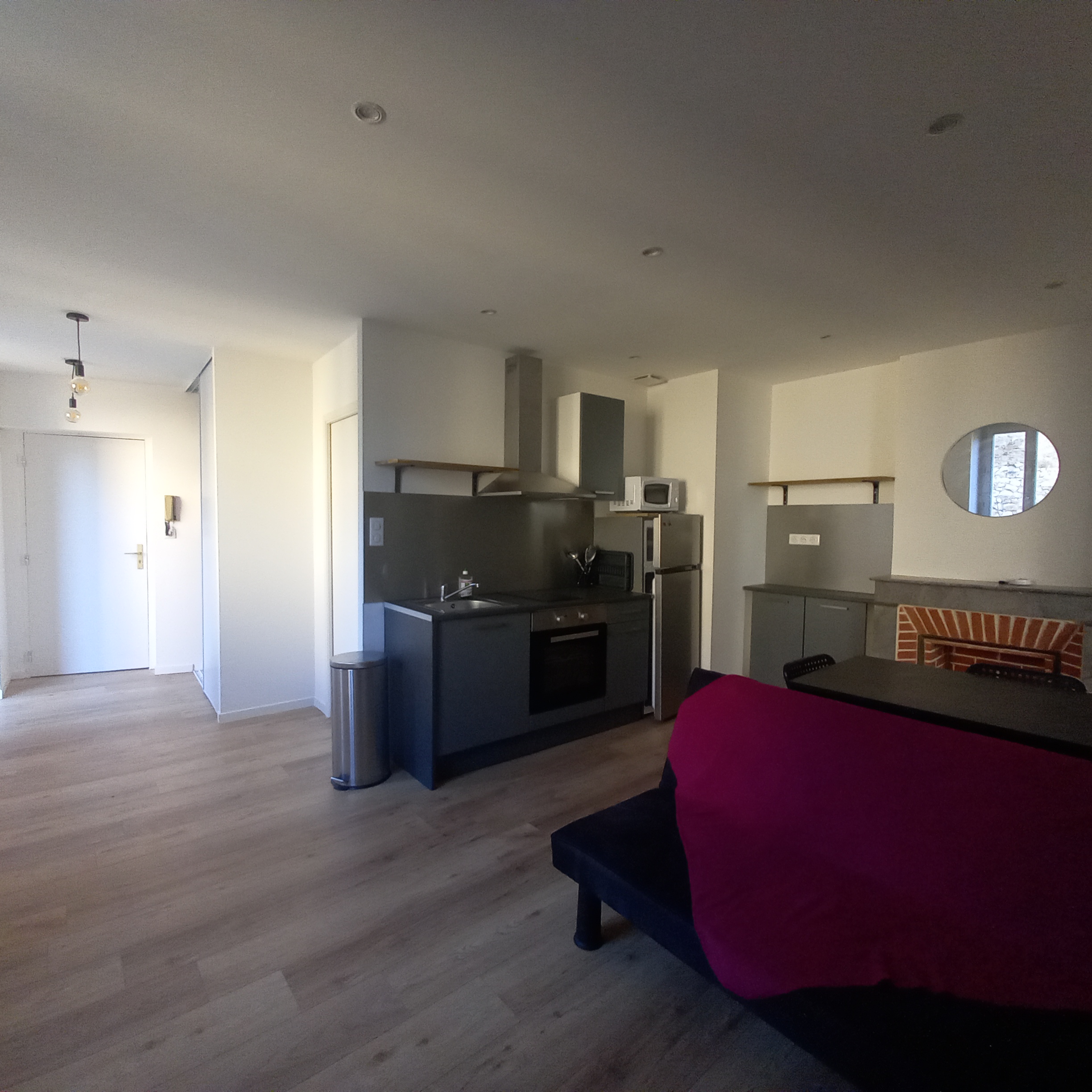 Au 1er étage d’un petit immeuble du centre ville de FIGEAC, appartement T2 meublé de 37.40 m² comprenant : une entrée (placard), une salle d’eau avec wc, un séjour avec coin cuisine équipée et une chambre (avec placard) + petit extérieur privatif