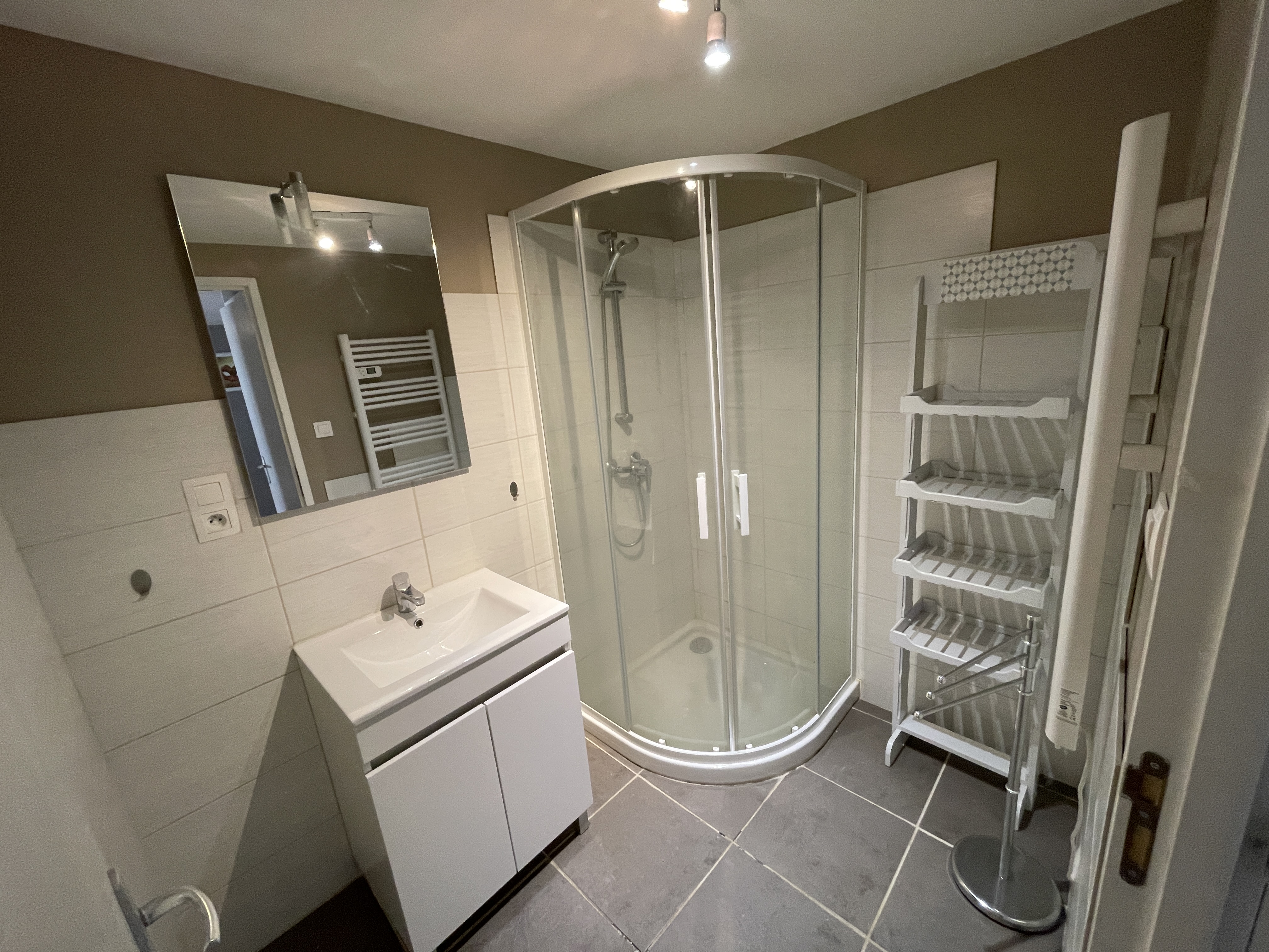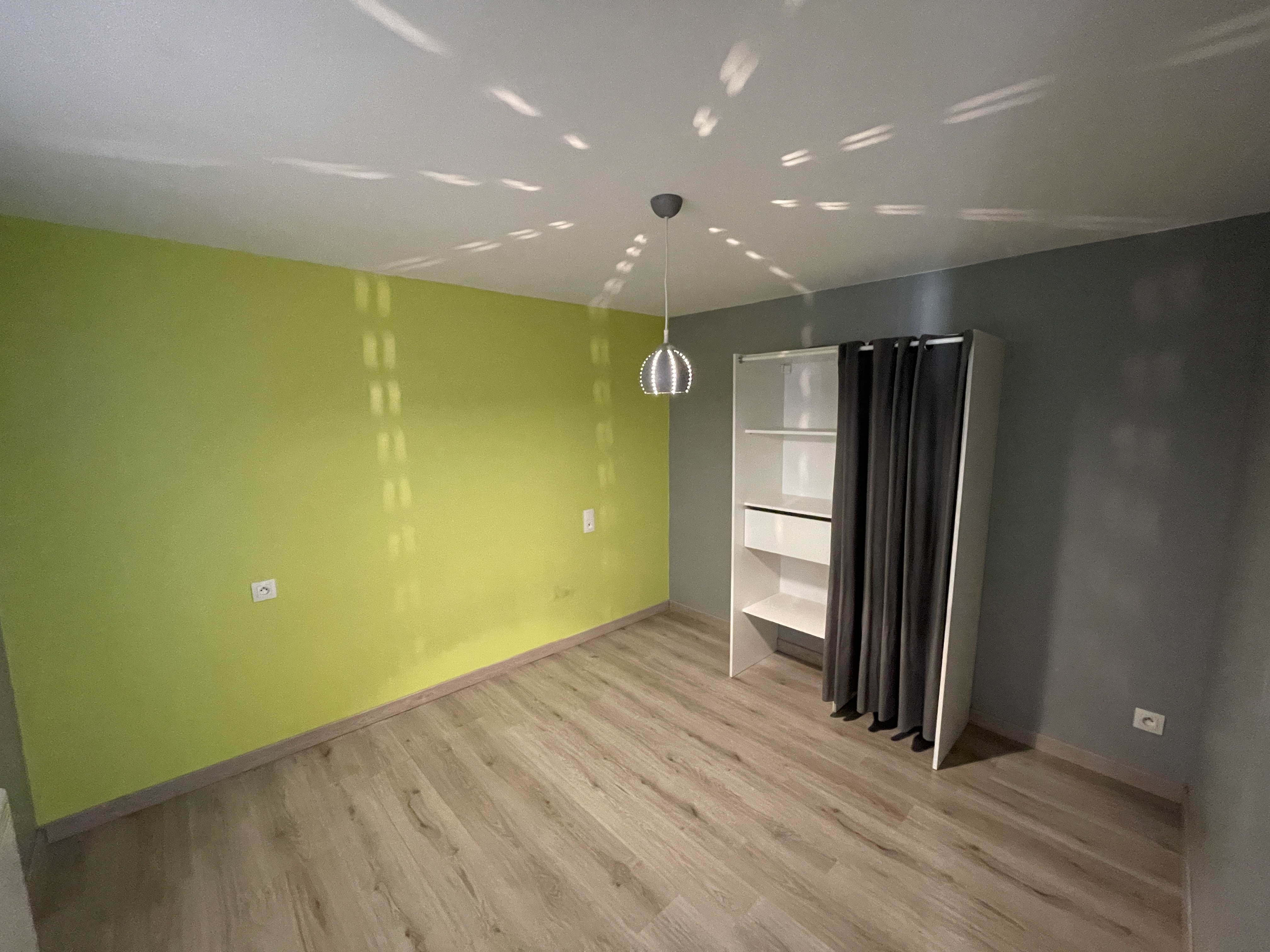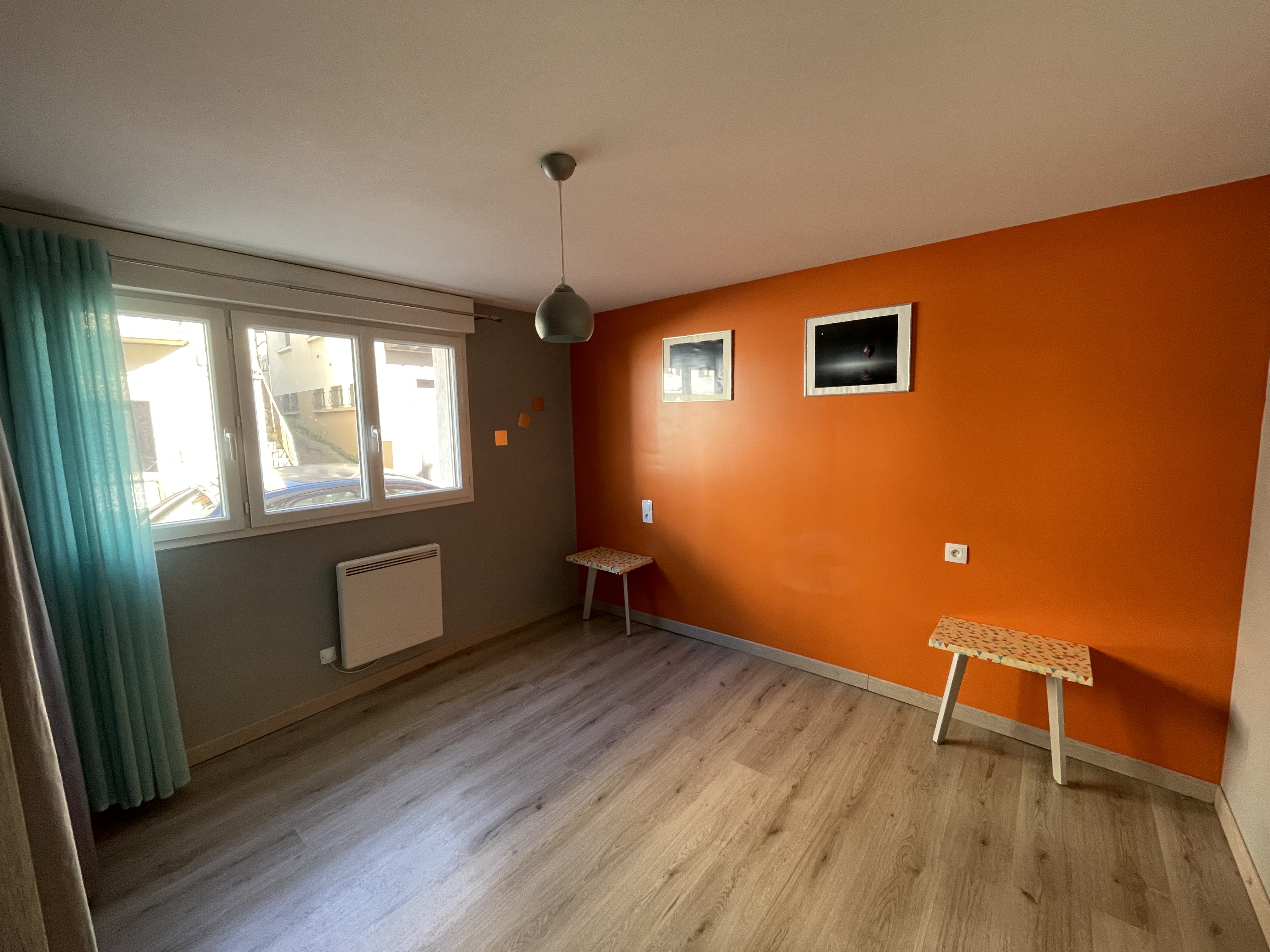Il se compose d’un séjour avec cuisine ouverte aménagée et équipée (plaques de cuisson, four, hotte, frigo, lave-linge, micro ondes), d’une chambre avec rangements, d’une chambre dite “aveugle” avec rangements, d’une salle d’eau, et d’un WC séparé.